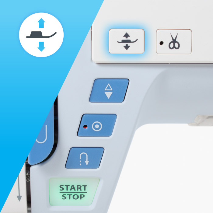Dvig šivalne tačke opravite enostavno s premikom vaše desne noge v stran, da so pri šivanju vaše roke proste. Dvig tačke je poljuben - lahko je minimalni pri šivanju robov, lahko maksimalni pri šivanju debelejših tkanin. Nepogrešljiv je tudi pri šivanju aplikacij.