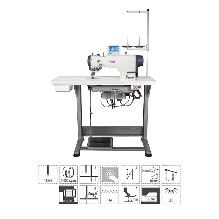 Veliko prostora med igelno osjo in vratom stroja (povečana na 29 cm) zagotavlja preprosto in priročno rokovanje z materialom. Opremljen z energijsko varčnim AC servo motorjem in koračnima motorjema za pogon igelne osi in transportnih zobcev.