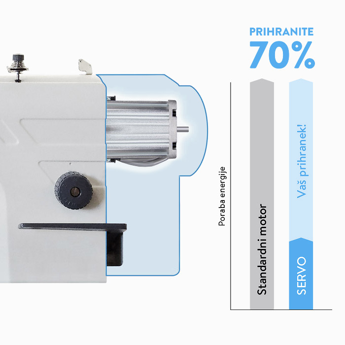 Zahvaljujoč integraciji vseh najpomembnejših elementov v glavo stroja, industrijski šivalni stroj deluje mirno in brez odvečnih vibracij. AC Servo motor je enofazni motor (220V), ki privarčuje do 70% električne energije v primerjavi z standarnimi električnimi motorji ali motorji s sklopko.